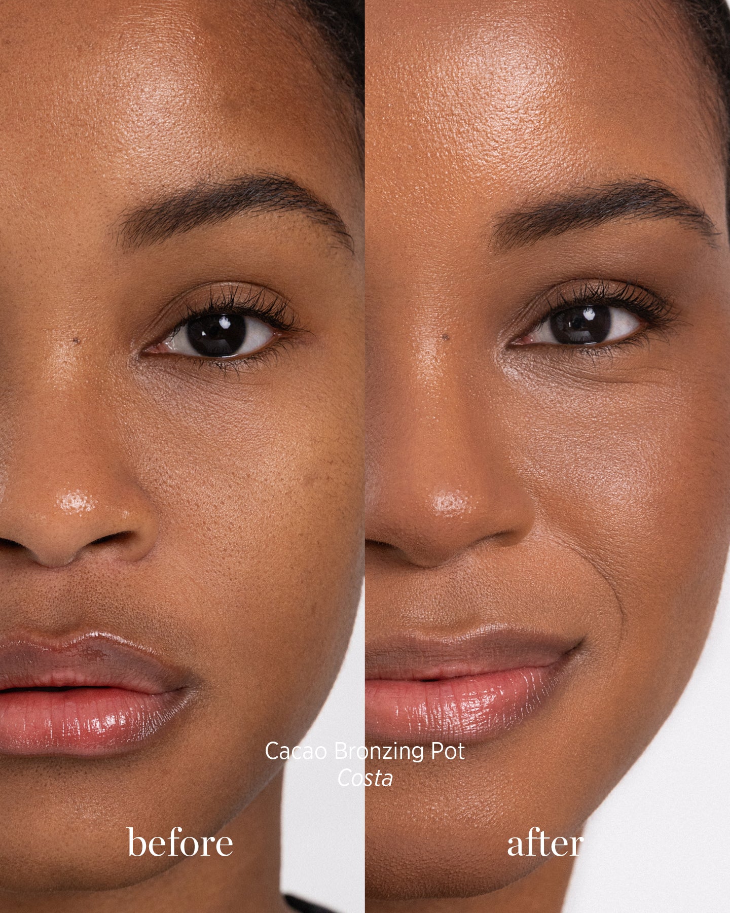 A whipped, mousse-like cream bronzer, the Cacao Bronzing Pot melts effortlessly into the skin, delivering a skin-like, semi-matte bronze with a sheer, sun-kissed glow - all without shimmer. Enriched with cacao seed butter, shea butter, and vitamin E, it nourishes while bronzing, leaving skin hydrated and healthy. Multi-use and easy to apply with fingers, Bio All-Beauty Sponges, or the Multipurpose Brush, it’s perfect for cheeks, eyelids, and temples. Housed in a luxurious glass jar with a subtle cocoa scent, it gives a velvety, effortless warmth your skin will love.