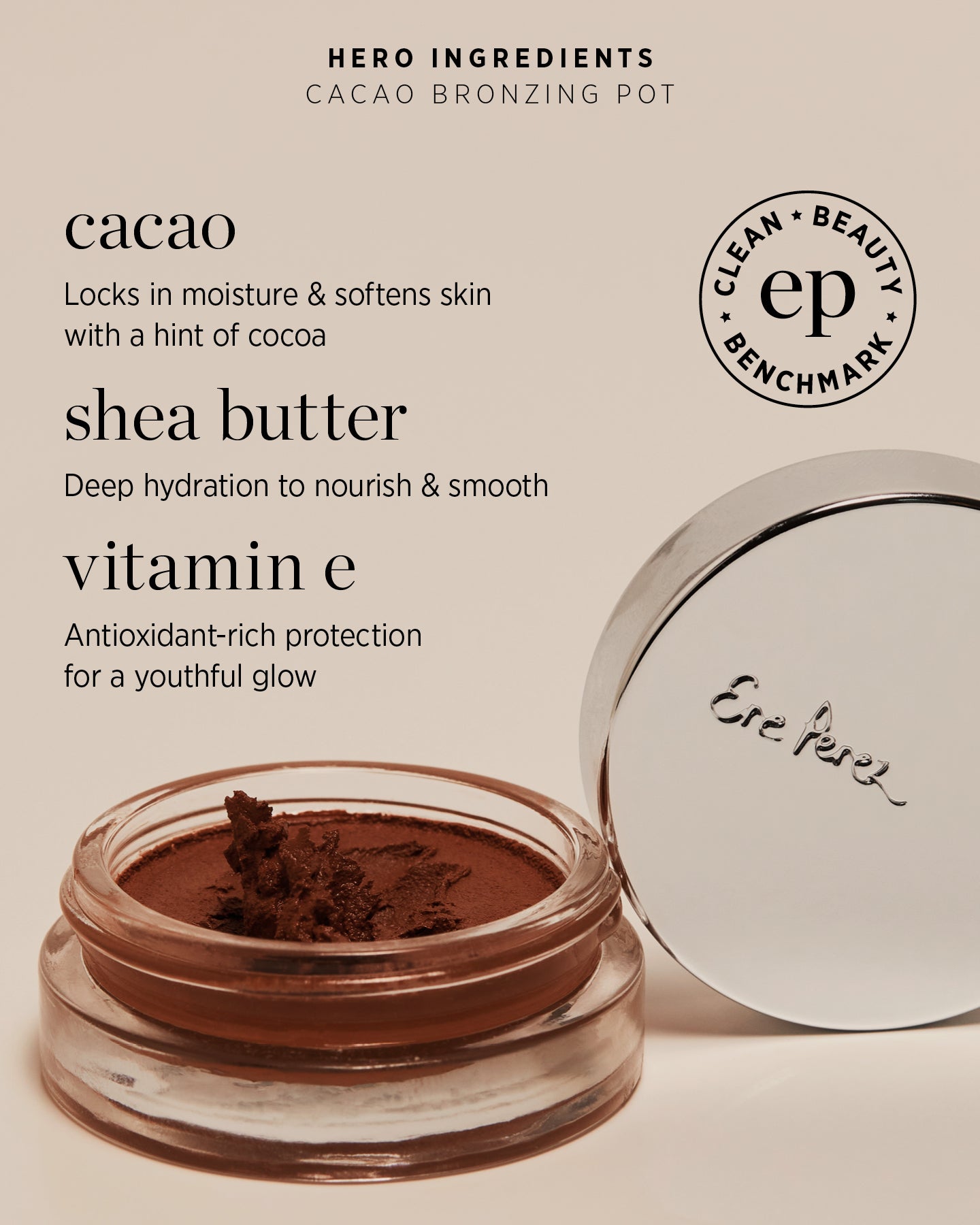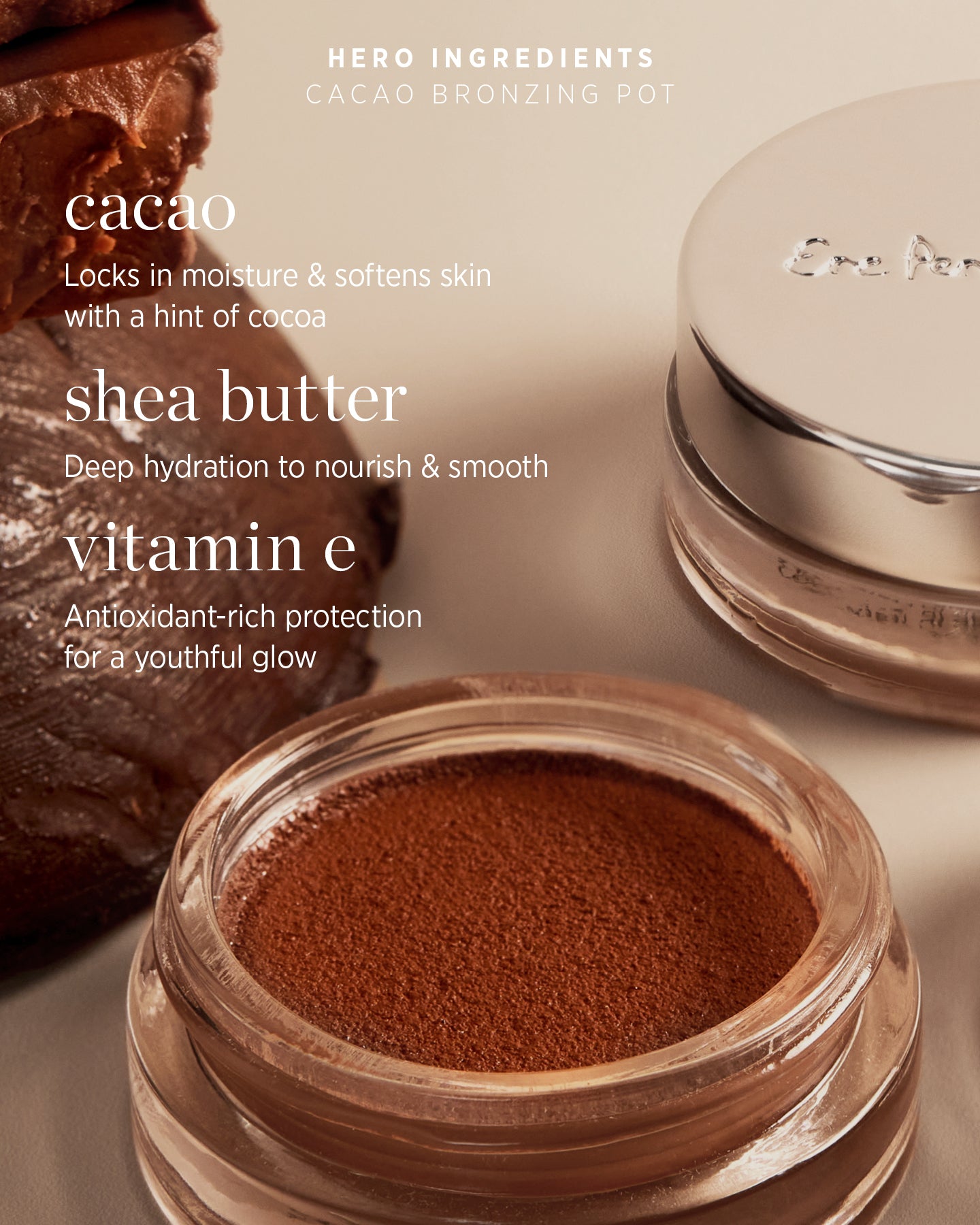 Hello sunshine! We’ve formulated the secret to hydrating, sun-kissed, beachy bronzed glow. Extend your summer radiance, year-round with Cacao Bronzing Pot. Give your complexion a seamless bronze, with a buttery...