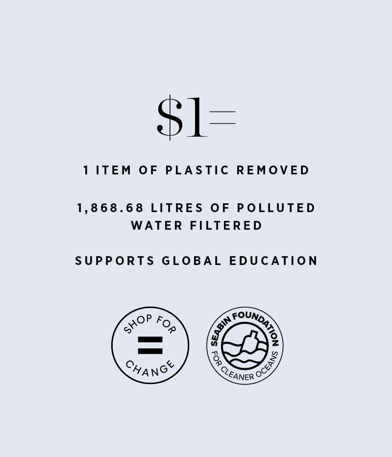 In partnership with i=Change, we’re donating $1 of every order to SEABIN, an innovative initiative tackling ocean pollution by removing plastic waste directly from our waterways.
